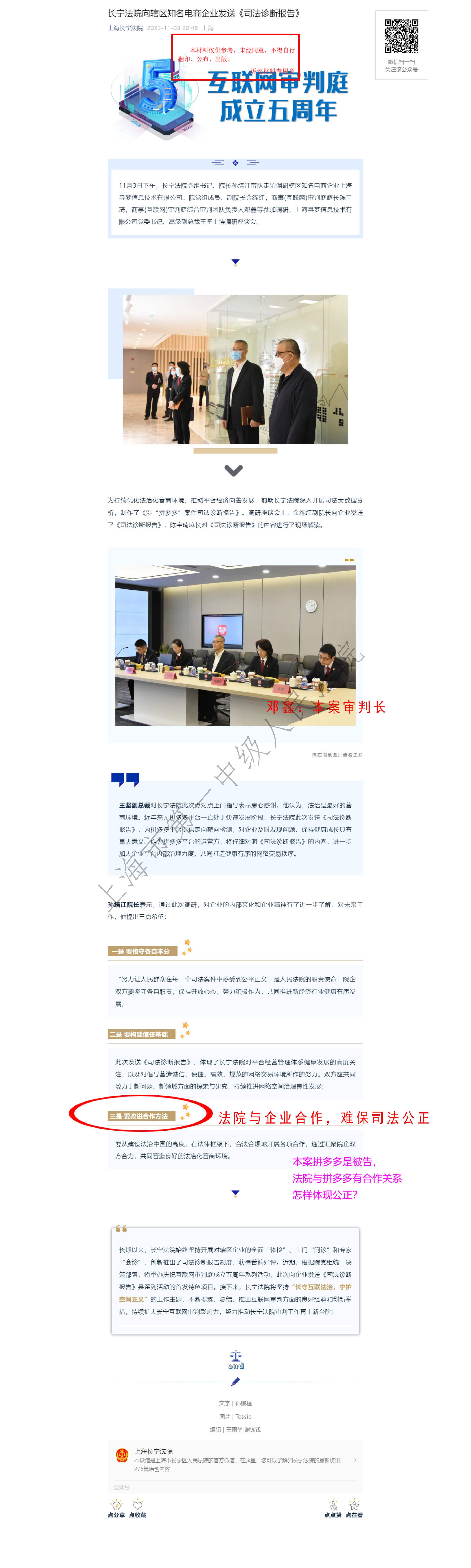 9. 违纪违法动机 长宁法院与被告拼多多有合作关系,邓鑫法官是合作组核心成员,依法应当自行回避。 (1)【证据】两则公开新闻报道 ①【聚焦大调研】长宁法院:提供优质法律服务 聚焦互联网平台法治化建设 上海高院 2018年03月05日 19:29 上海 全文出处:https://mp.weixin.qq.com/s/UFeNAC89kH40BkuUErdvdA 2018年3月2日,长宁法院党组书记、院长米振荣,党组成员、副院长金练红,互联网审判庭、研究室负责人等一行,赴互联网企业拼多多调研。|||(注:该研究室负责人系本案原审审判长邓鑫) ……拼多多董事长黄峥谈到,……其在创立与发展阶段也需要有关部门在多方面予以支持。 ② 长宁法院向辖区知名电商企业发送《司法诊断报告》 上海长宁法院 2022-11-0320:46 上海 出处:上海市长宁区人民法院的官方微信 2022年11月3日下午,长宁法院党组书记、院长孙培江带队走访调研辖区知名电商企业上海寻梦信息技术有限公司。院党组成员、副院长金练红,商事(互联网)审判庭庭长陈宇琦,商事(互联网)审判庭综合审判团队负责人邓鑫等参加调研,上海寻梦信息技术有限公司党委书记、高级副总裁王坚主持调研座谈会。(注:邓鑫是本案原审审判长,开庭临时替换祁晓栋) ……王坚副总裁对长宁法院此次点对点上门指导表示衷心感谢。 ……孙培江院长……对未来工作,他提出三点希望:……三是 要改进合作方法。