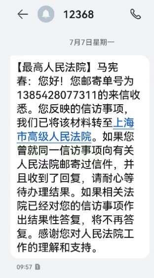 202577日,à【最高人民法院】(第三巡回法庭)马宪春:您好!您邮寄单号为1385428077311的来信收悉。您反映的信访事项,我们已将该材料转至上海市高级人民法院。如果您曾就同一信访事项向有关人民法院邮寄过信件,并且收到了回复,请耐心等待办理结果。如果相关法院已经对您的信访事项作出结果性答复,将不再答复。感谢您对人民法院工作的理解和支持。还有邮寄单号:13854173010111385396896311