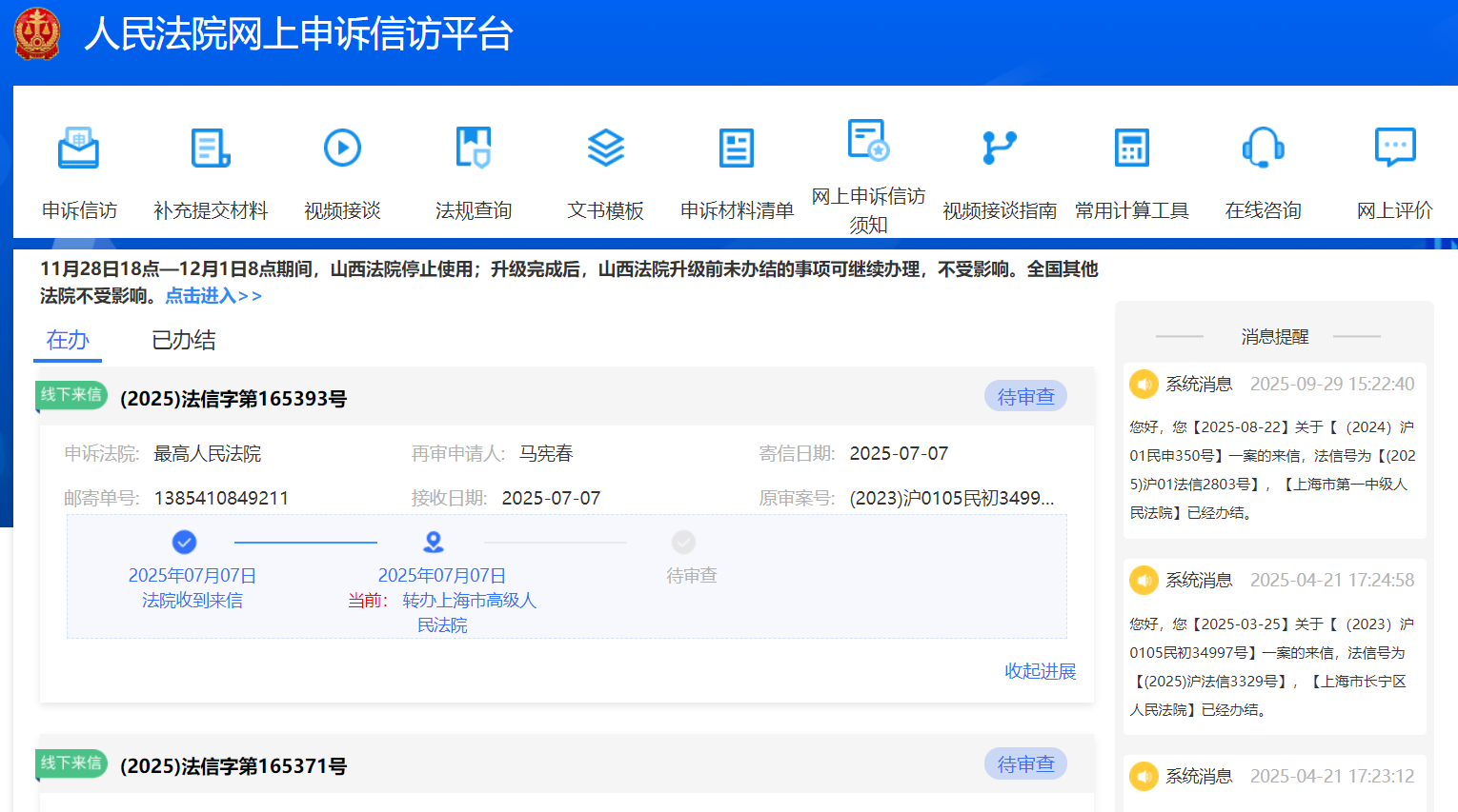 图中显示:线下来信编号(2025)法信字第165393号,申诉法院:最高人民法院,20250707日法院收到来信,20250707日,当前:转办 上海市高级人民法院,至今仍待审查状态。