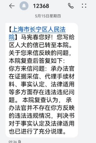 如果把长宁法院针对长宁区人大回复算作以前答复的话(除此再无其它答复),请看答复结果:à515日【上海市长宁区人民法院】马宪春您好!您写给区人大的信已转至本院。关于您来信反映的问题,本院复查后答复如下:你方来信问题:承办法官证据采信、代理手续材料、事实认定、法律适用等多方面存在违法违纪问题。本院复查认为承办法官存在你方反映的违法违规情况判决书对于事实认定及法律适用也已进行了充分说理